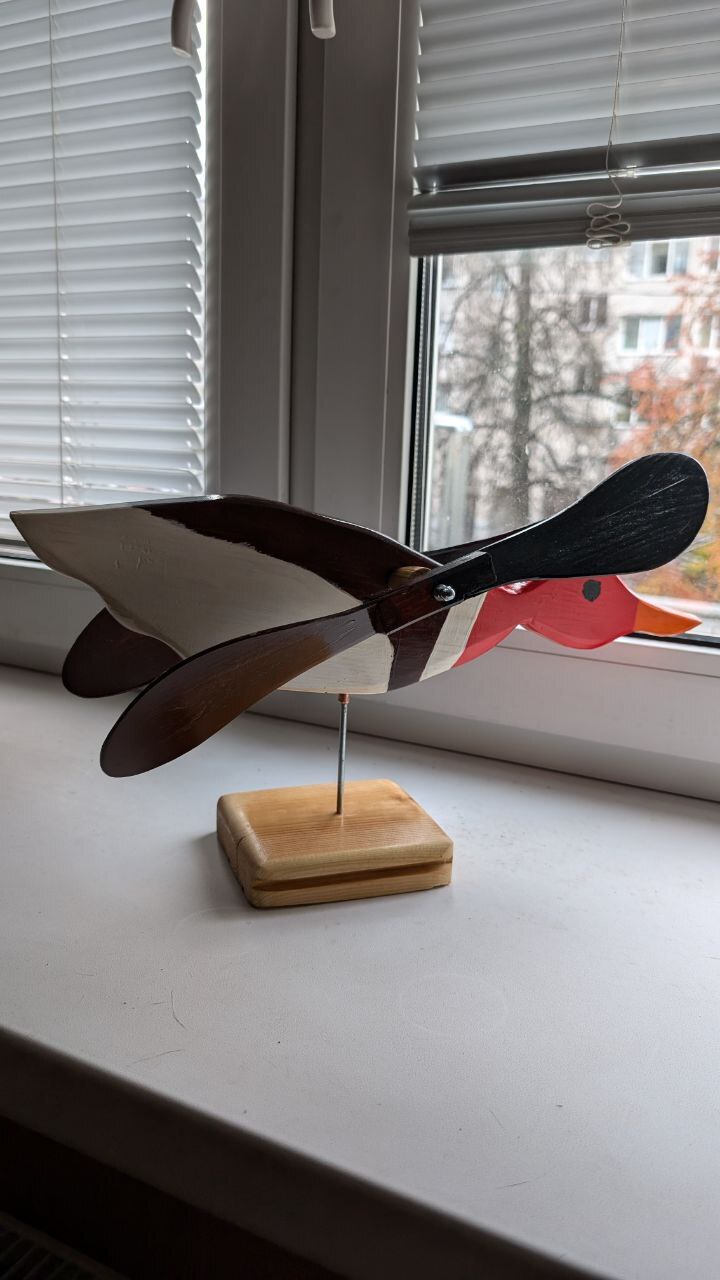 Это простая мастерская, где основное делается ручным инструментом. Я делаю флюгеры в виде птиц, которые машут крыльями. Материал сосновые доски разной толщины.